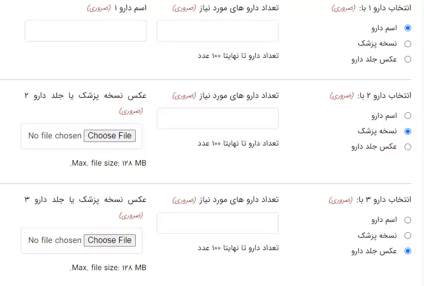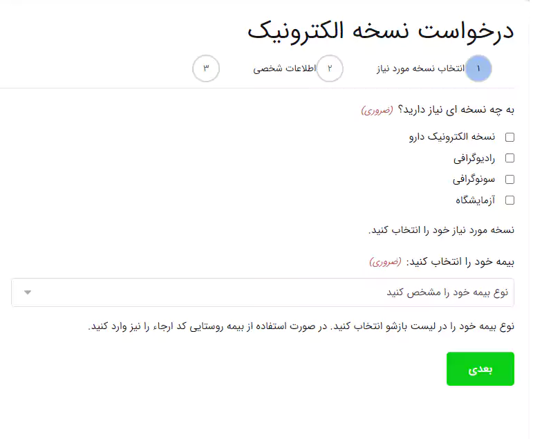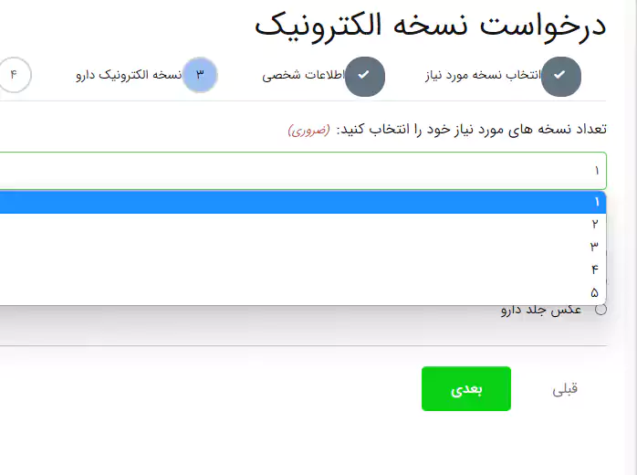 در این بخش اگر نسخه الکترونیک دارو را انتخاب کرده باشید باید تعداد نسخه دارو های مورد نیاز خود را انتخاب کنید.