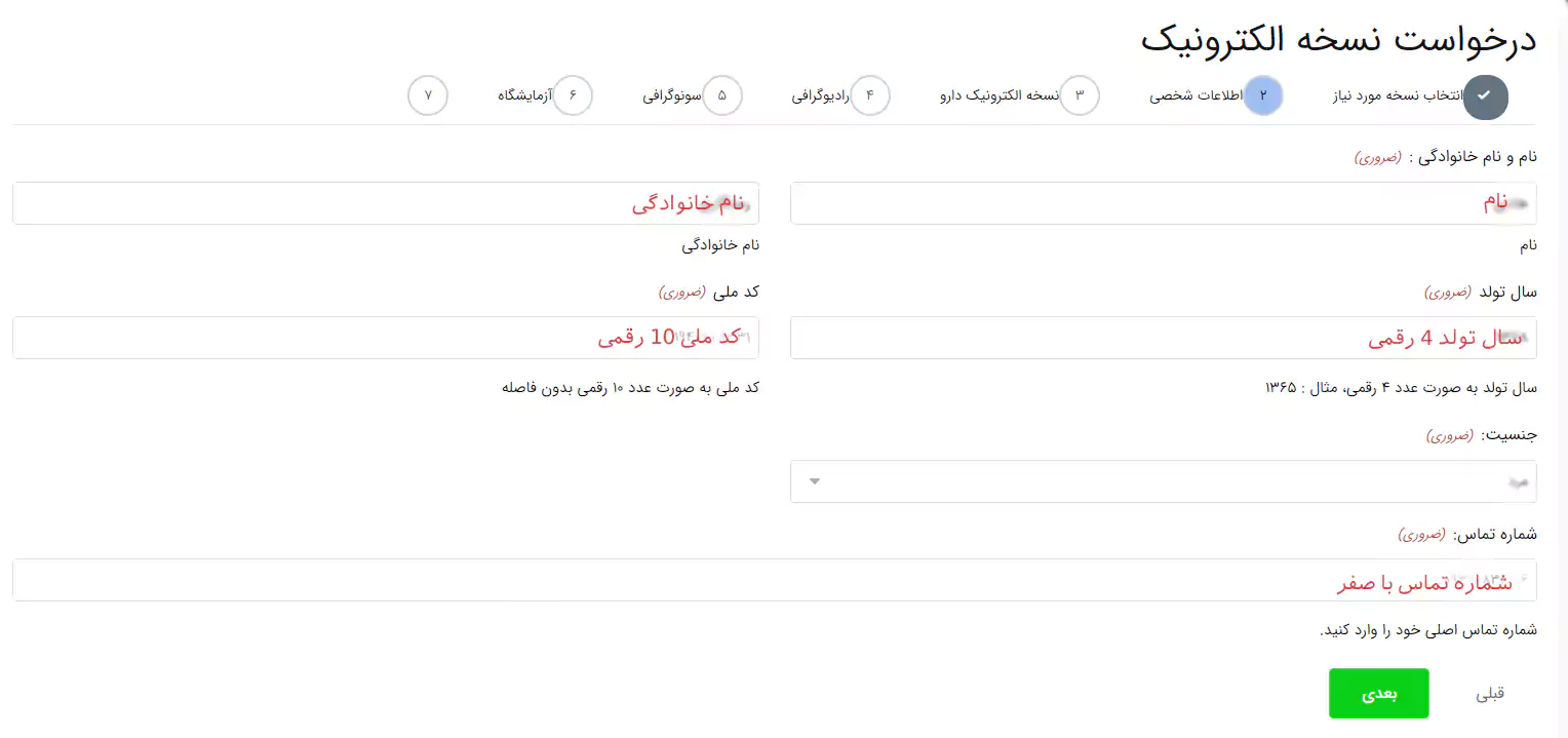 در این قسمت باید تمام مشخصات را به طور کامل وارد کنید تا بتوانید به ادامه مراحل ثبت نسخه بپردازید.